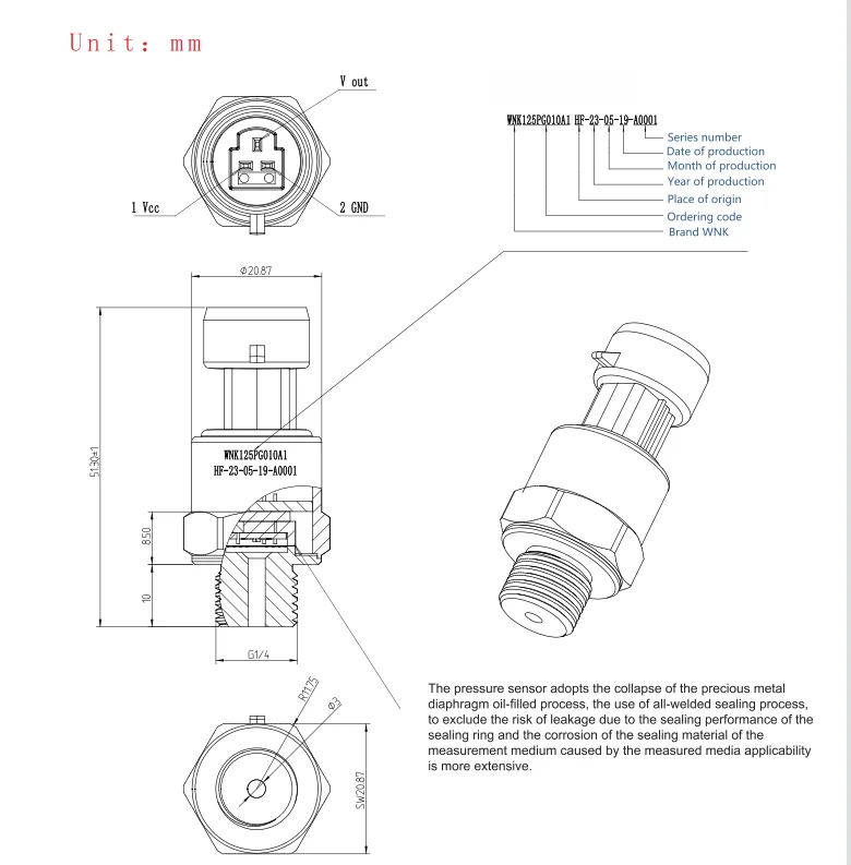 WNK811 is a series of high performance compact pressure transducer, by using ASIC signal conditioning chip and dry ceramic capacitive pressure sensor. It has features of anti-corrosion, anti-wear, shock resistance and vibration resistance. Its anti-overload capacity is up to 10 times of the range, completely solved poor overload in small range of other sensors. In addtion to general ranges of normal sensors, its most outstanding characteristic is the positive and negative gauge pressure function. With high output and wide range, WNK80MA is especially suitable for manufacturing of high-performance industrial control pressure transmitter and harsh environment pressure measurement.